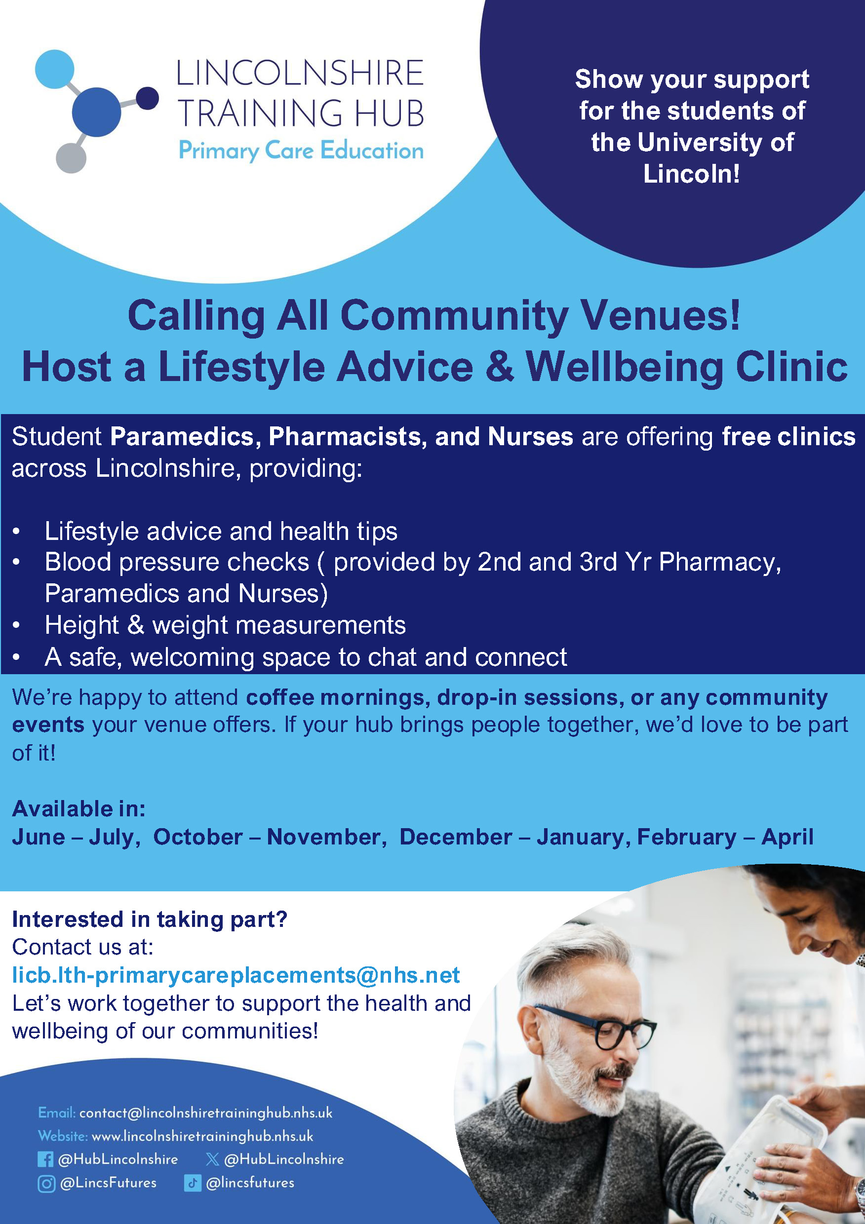We are reaching out to invite community venues across Lincolnshire to host a free Lifestyle Advice & Wellbeing Clinic, delivered by student Paramedics, Pharmacists, and Nurses from the University of Lincoln.